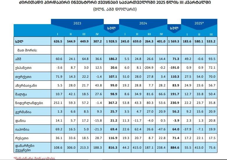 2025 წლის III კვარტალში საქართველოში განხორციელებული პირდაპირი უცხოური ინვესტიციების მიხედვით, უმსხვილესი ინვესტორი ქვეყნები შემდეგნაირად განაწილდა, იხილეთ ცხრილი :